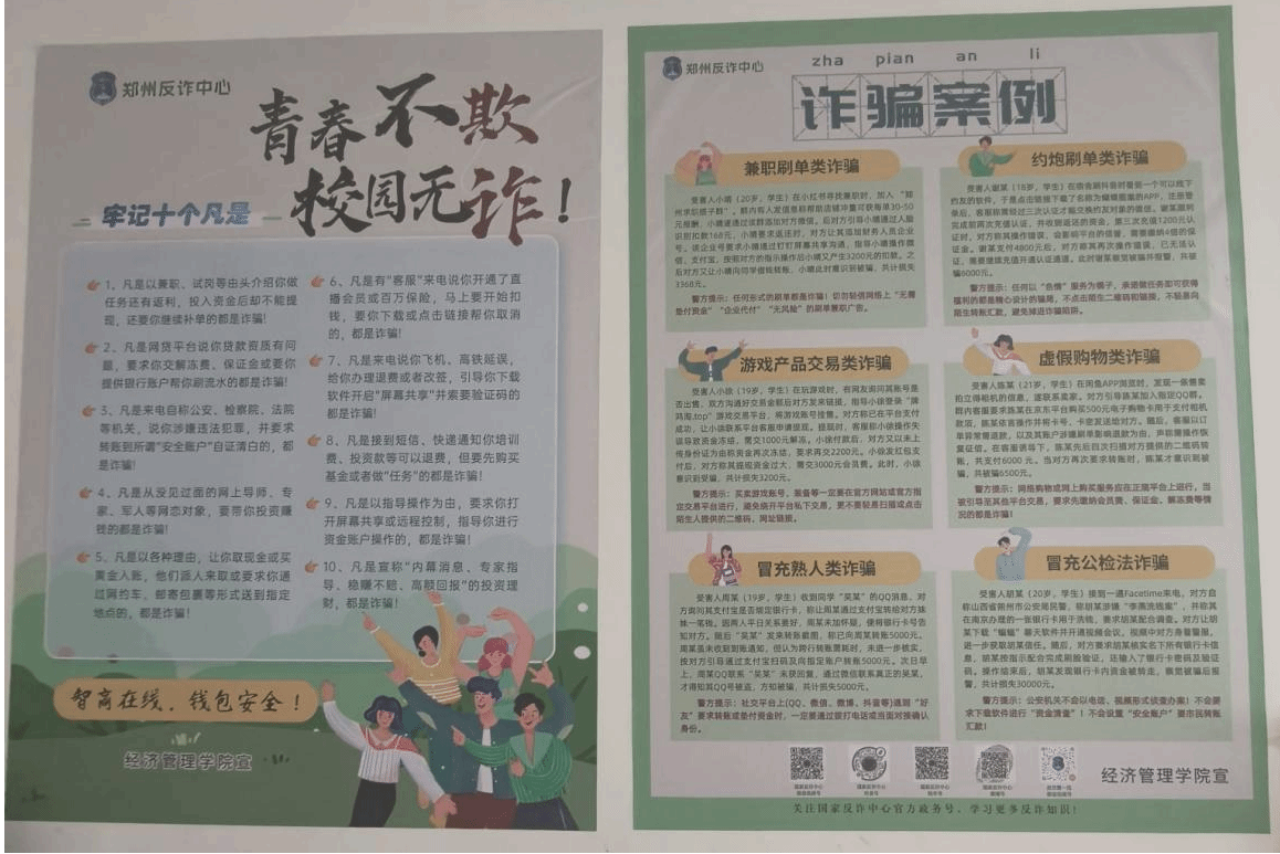 在反诈防骗宣传方面则紧扣“三不一多”核心原则,通过宣传资料重点解读“未知链接不点击、陌生电话不轻信、个人信息不透露、转账汇款多核实”的防骗要点,着力提升学生对电信网络诈骗的识别与抵御能力。