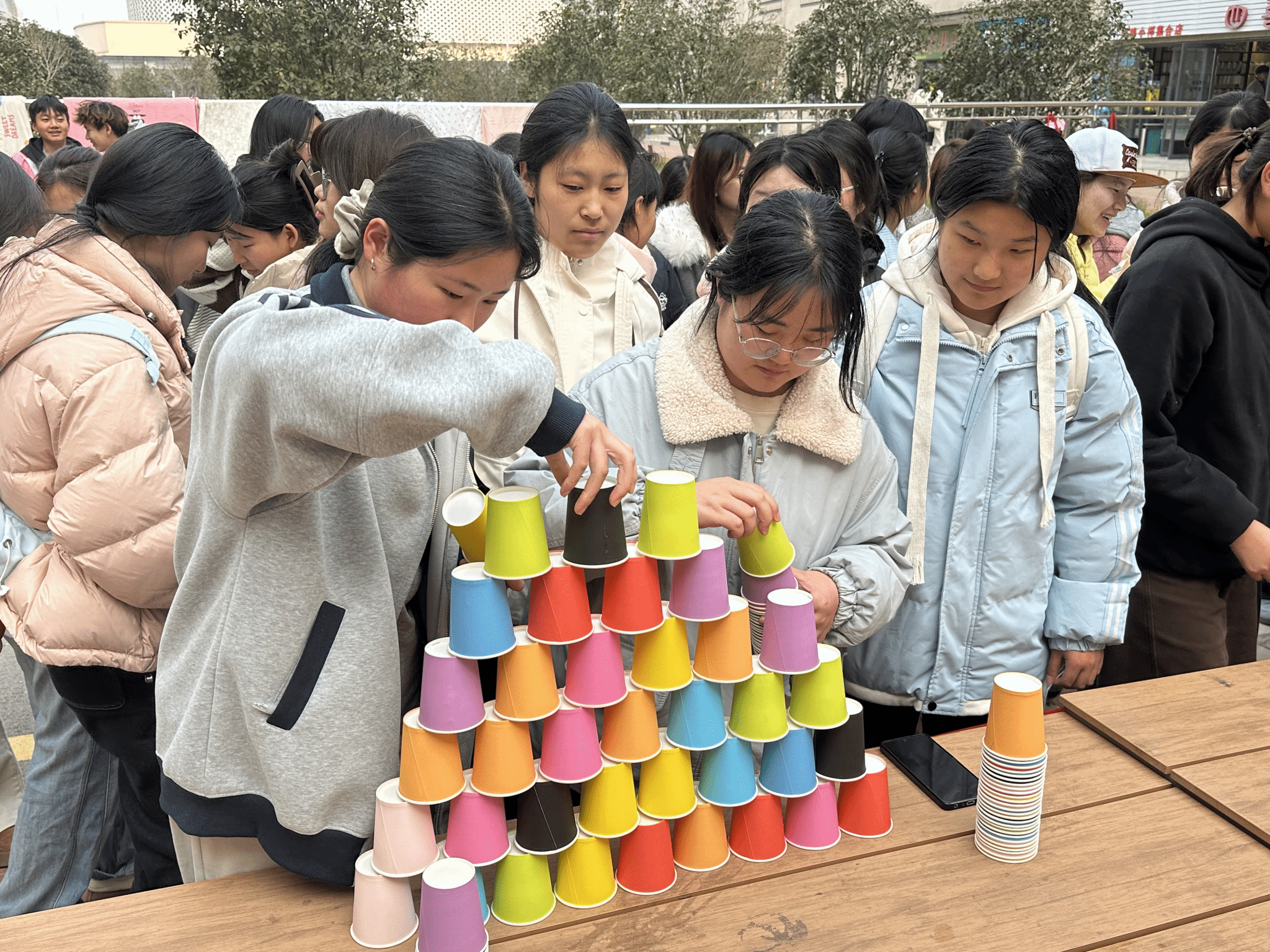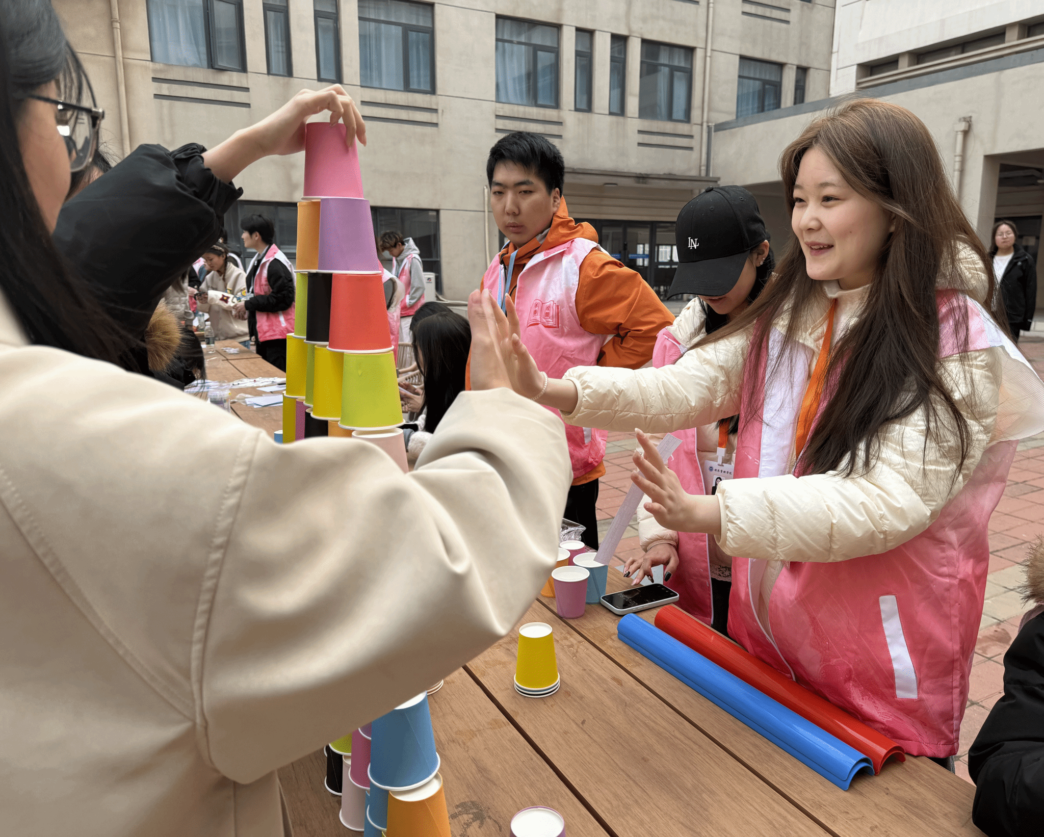 本次活动充分发挥“一站式学生社区”的阵地优势,采用自由组队与现场随机配对相结合的方式进行,两人一组固定搭档参与全程比拼。活动现场设在社区共享空间,氛围温馨活跃。活动设置“默契搭搭乐”“携手绕障碍”“珠运杯吹”“同心绘祝福”四项互动协作项目,同学们在游戏中分工配合、信任沟通,在轻松有趣的环节中提升默契度与协作能力,现场欢声笑语不断,充分展现了一站式社区服务学生、贴近学生、凝聚学生的平台功能。